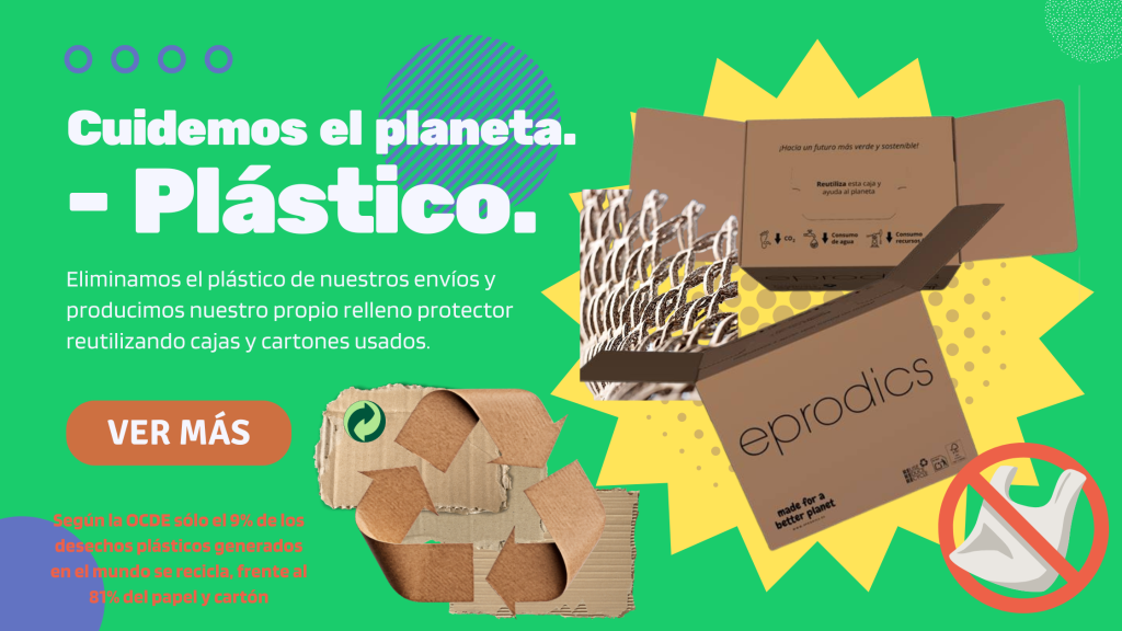 En Eprodics queremos contribuir positivamente al futuro, con acciones ecológicas para proteger el medio ambiente de forma práctica y útil. Es por ello que cerramos el círculo de los envíos englobando sistemas totalmente ecológicos: para las entregas usamos nuestras propias cajas ecológicas y sostenibles 2in1 de CAPSA, fomentando así la reutilización de las mismas, protegemos nuestros productos en su interior mediante relleno de cartón reutilizado fabricado en nuestras instalaciones, cerramos las cajas con precinto de papel reciclable y utilizamos, a la vez, sobres de envío (packing list) 100% de papel.